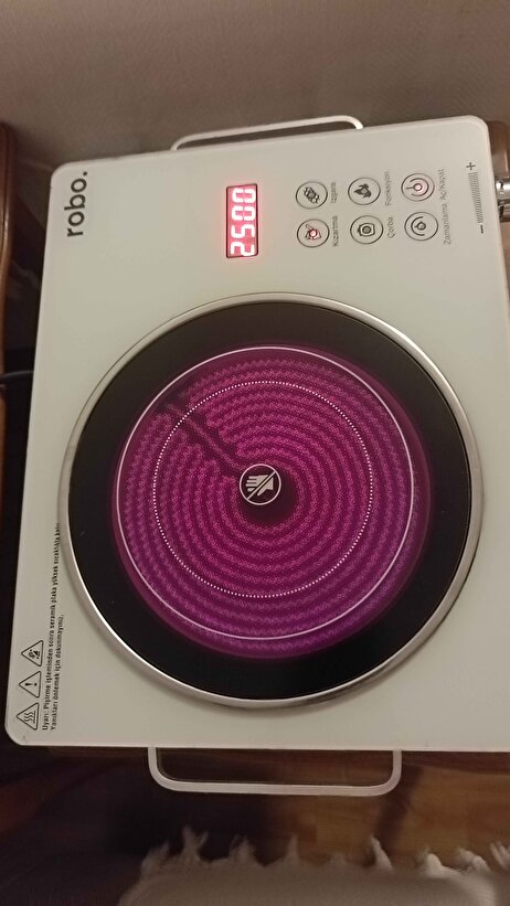 robo beyaz tekli elektrikli ocak, modern kullanım deneyimi sunan dokunmatik ekran ve döner düğme kombinasyonu ile tasarlanmıştır. Bu yapı sayesinde ayarları daha pratik şekilde yapabilir, güç ve sıcaklık seviyesini dijital ekran üzerinden rahatça takip edebilirsiniz.