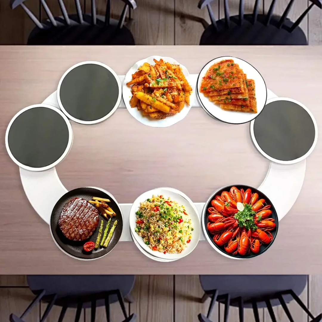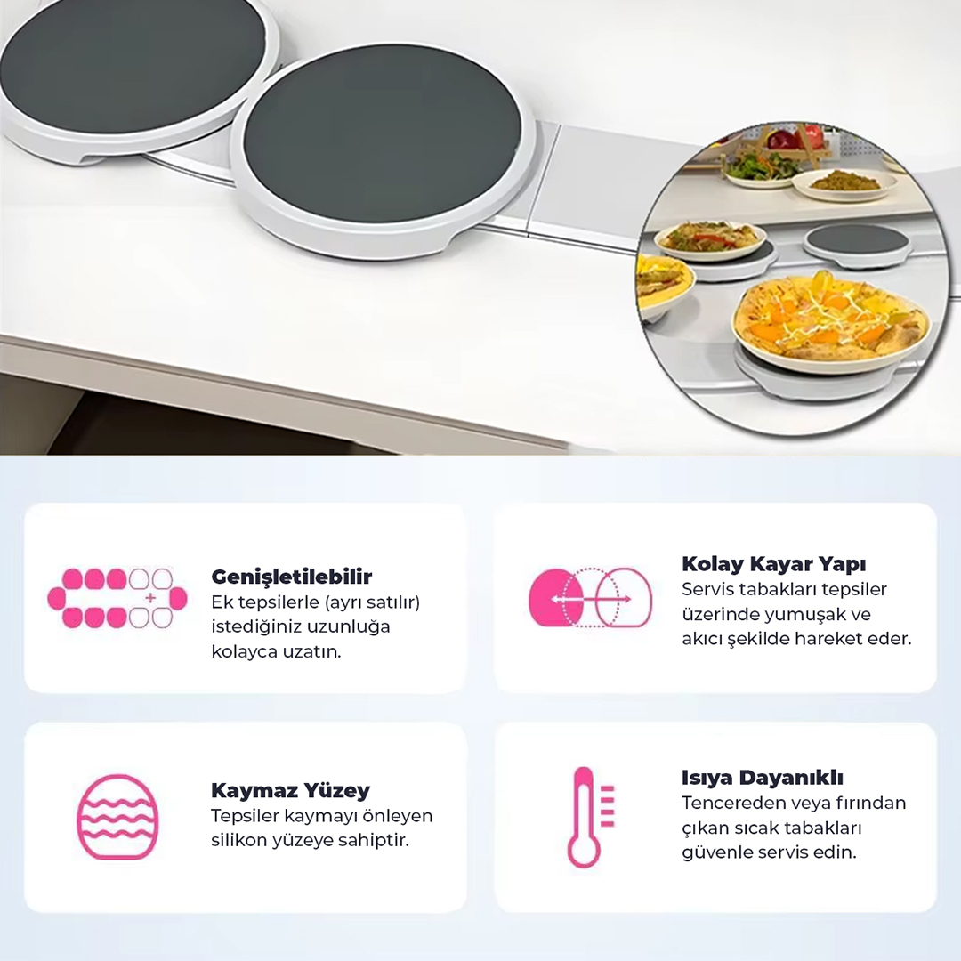 Özellikle kalabalık aile yemeklerinde, misafirli sofralarda ve uzun kahvaltı masalarında büyük rahatlık sunar. Sofrada düzeni artırır, servis sırasında sürekli kalkma ihtiyacını azaltır ve herkesin aynı anda servise erişmesini kolaylaştırır. Modern, şık ve fonksiyonel tasarımıyla hem ev kullanımı hem de profesyonel servis alanları için uygundur.