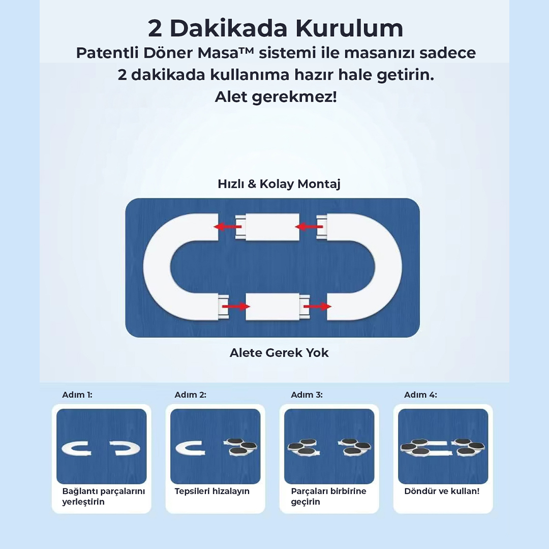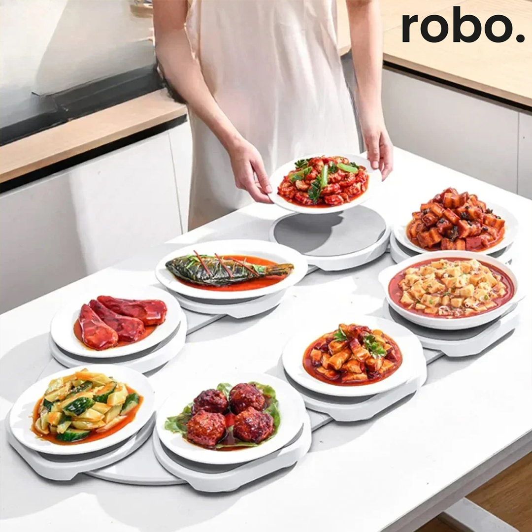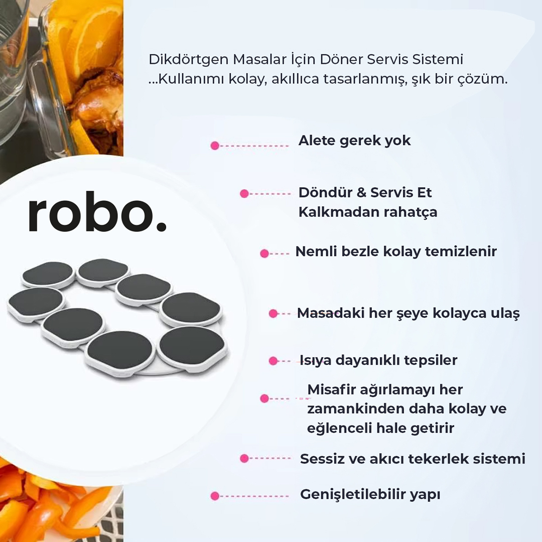 Kalabalık sofralarda servis artık çok daha pratik ve keyifli! robo Döner Servis Tepsisi, 360° dönebilen yapısı, sessiz ve akıcı döndürme mekanizması ve ısıya dayanıklı servis tepsileri sayesinde masadaki yiyecek ve içeceklere kalkmadan kolayca ulaşmanızı sağlar.