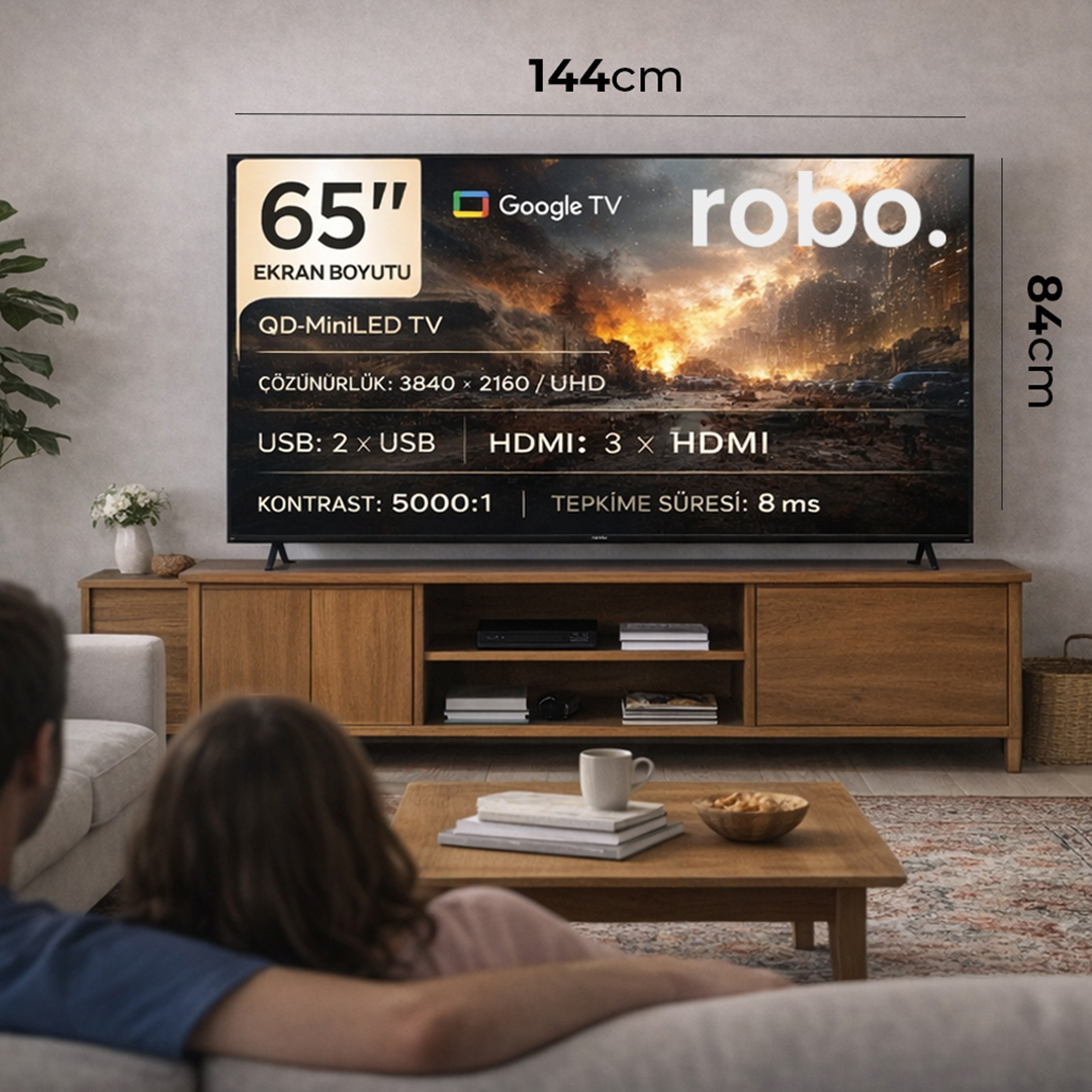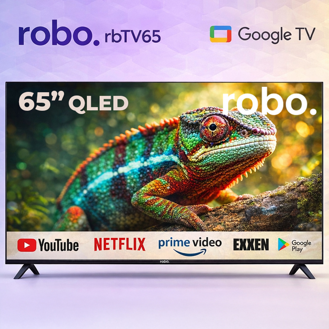 💡 robo 65” QLED TV, kompakt boyutu, güçlü donanımı ve etkileyici görüntü performansıyla salonunuza sinema atmosferi getirir. Filmler, spor, oyunlar — hepsi 4K netliğinde, üstün QLED kalitesiyle!