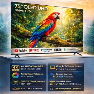75 ekran boyutu salon için tam ideal. Görüntü kalitesi çok net, özellikle 4K filmlerde farkı hissediyorsunuz. sistemi hızlı çalışıyor, uygulamalar arasında takılma olmuyor. Bu fiyata bu kalite gerçekten şaşırtıcı.