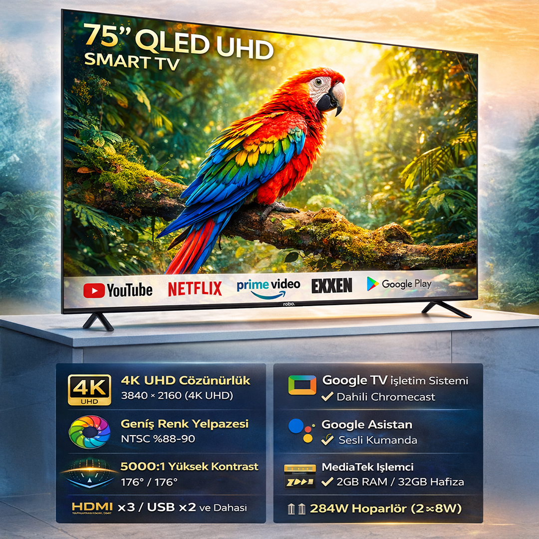 Yeni robo 75” Smart Google TV, geniş ekranı ve 4K UHD + HDR10 görüntü desteğiyle her sahneyi daha canlı ve net gösterir. 2.4G/5G Wi-Fi, Bluetooth 5.1, DVB-S2 dahili uydu alıcısı ve akıllı özellikleriyle modern evler için güçlü ve pratik bir seçimdir.