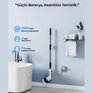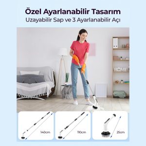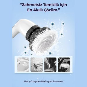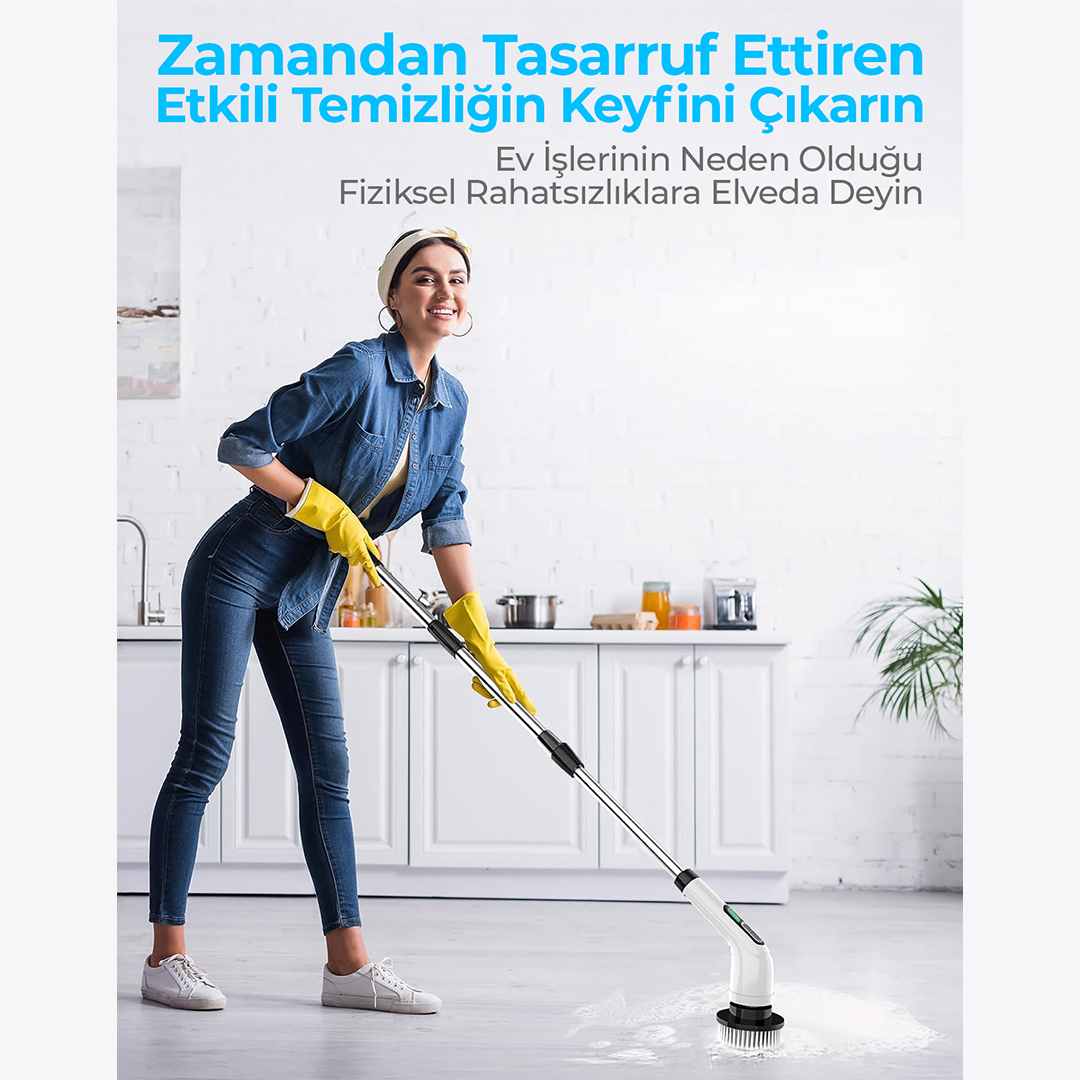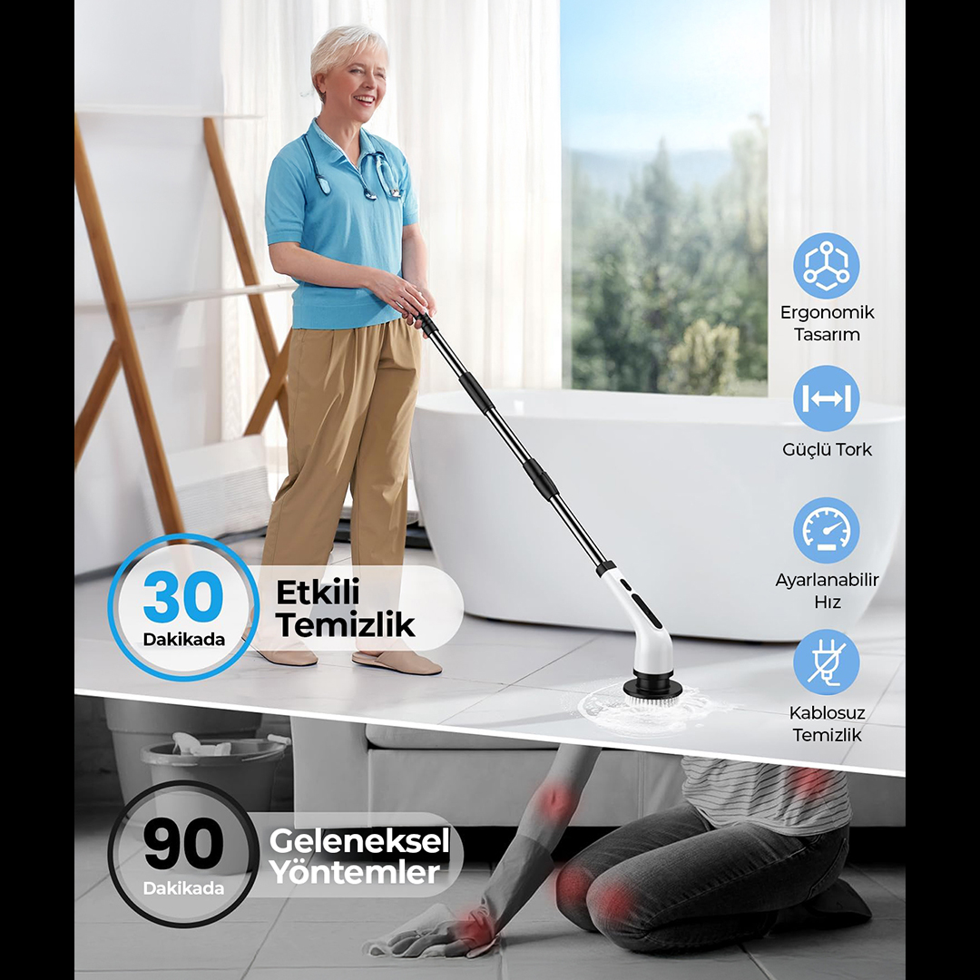 Bu akıllı temizlik fırçası sayesinde: 90 dakikalık işi 30 dakikada tamamlarsınız, Yüzeylere eşit baskı uygulayarak daha hijyenik ve derinlemesine temizlik sağlarsınız, Yormadan, eğilmeden kolayca temizlik yaparsınız.