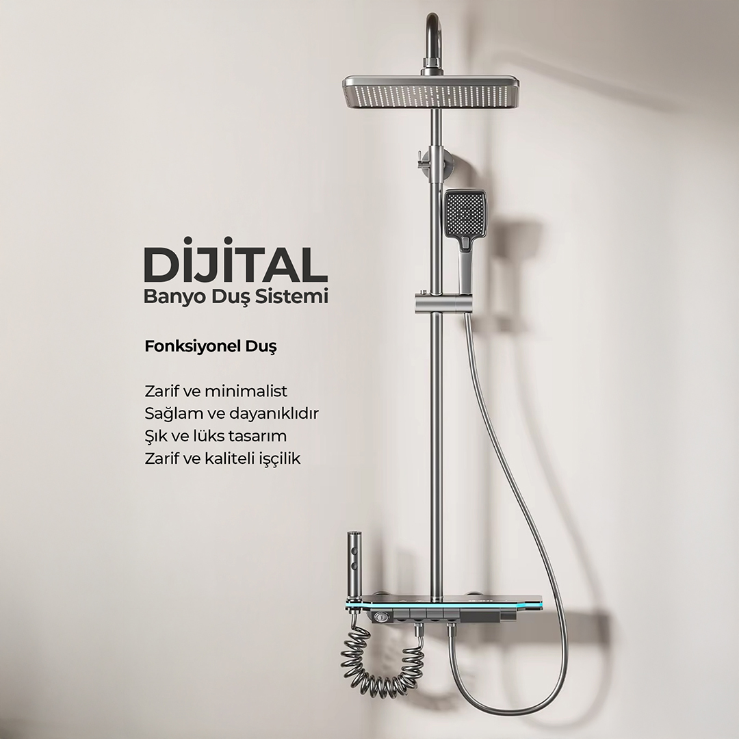robo A80015 Dijital Duş Sistemi, modern tasarımı ve akıllı kullanım özellikleriyle günlük duş deneyimini üst seviyeye taşır. Minimal çizgileri, paslanmaz dayanıklı gövdesi ve LED göstergeli dijital paneli sayesinde banyonuza hem estetik hem de fonksiyonel bir değer katar.