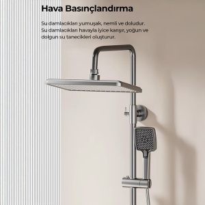 Geniş üst yağmur duş başlığı: Doğal yağmur hissi vererek tüm vücudu eşit şekilde sarar.