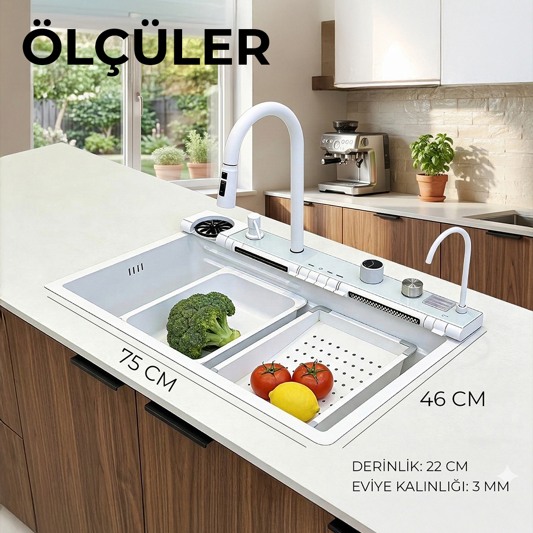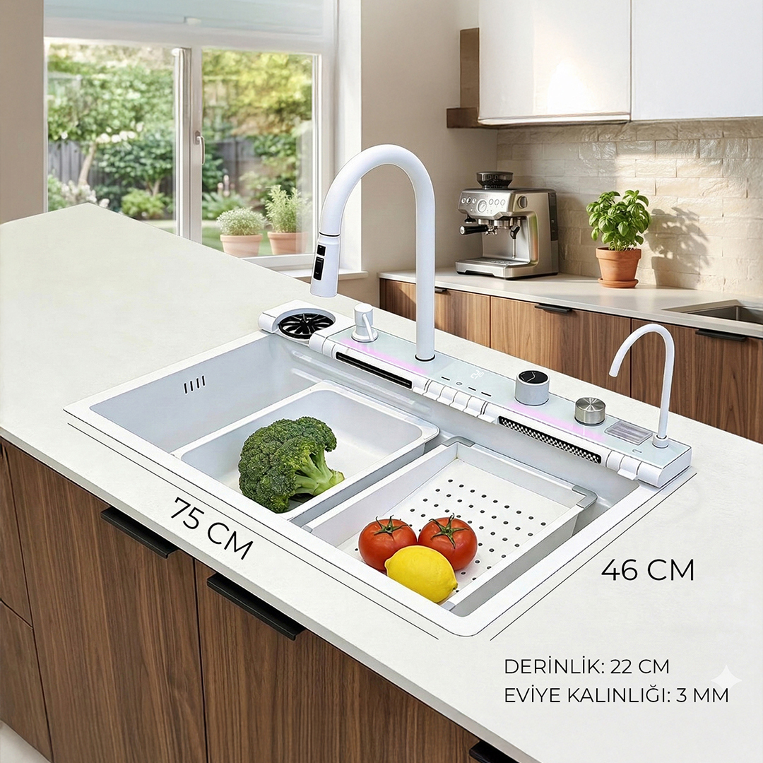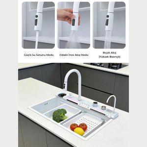 Mutfakta sadece bir evye değil, aynı zamanda teknolojik ve çok işlevli bir kullanım alanı arıyorsanız bu ürün güçlü bir çözümdür. Şık görünümü, dayanıklı malzemesi, dijital ekranı ve çok fonksiyonlu sistemi sayesinde hem modern mutfak dekorasyonuna uyum sağlar hem de günlük işlerinizi kolaylaştırır.