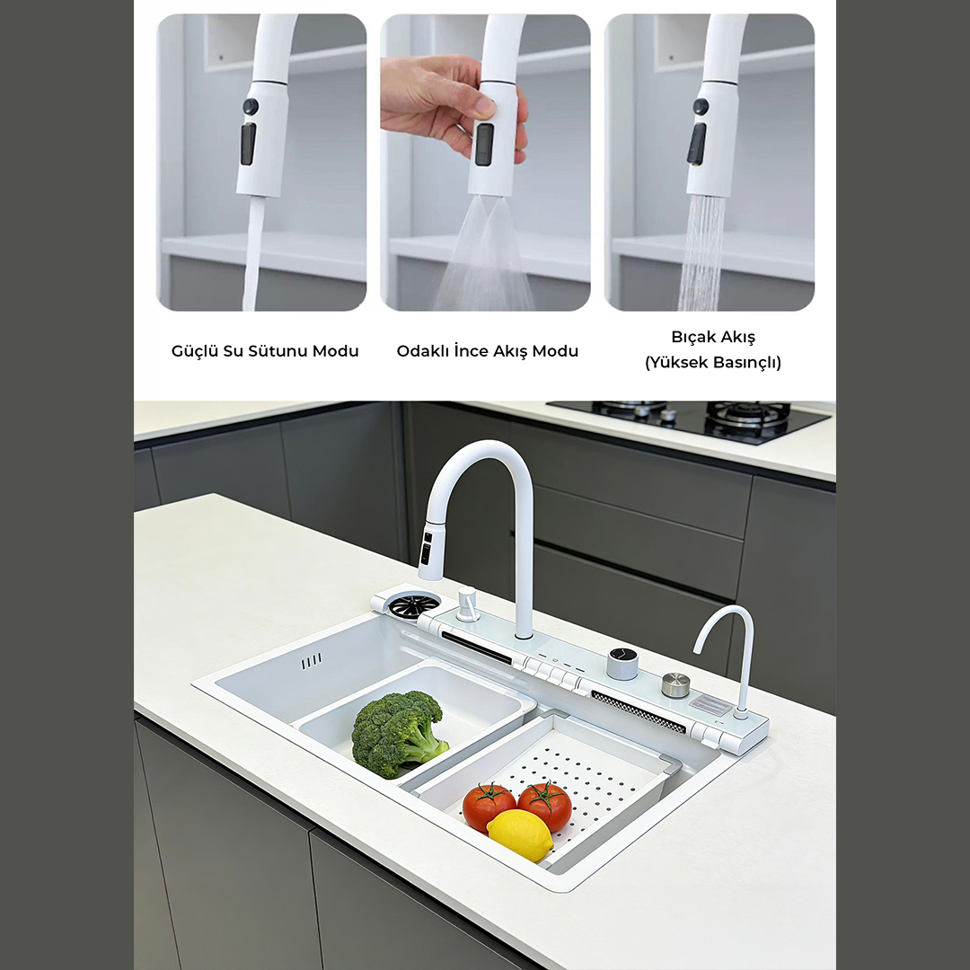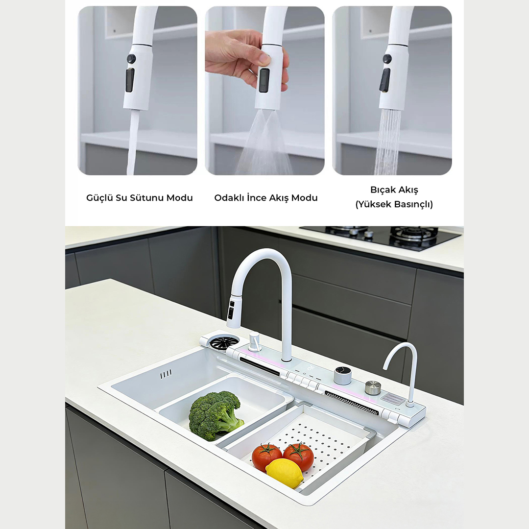 Mutfağınızda hem şıklığı hem de işlevselliği bir arada isteyenler için geliştirilen robo Dijital Akıllı Eviye Seti Beyaz, modern tasarımı ve 7 fonksiyonlu kullanım sistemi ile mutfakta günlük işleri daha pratik hale getirir.