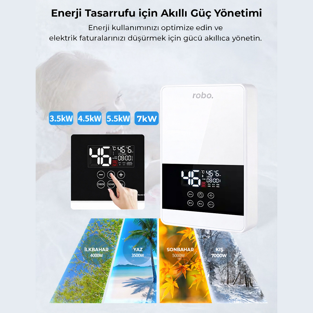 Robo Dijital Akıllı Şofben, açıldığında anında ısınır. Ön ısıtma gerektirmez, sıcak su için beklemek tarihe karışır. Su akışı durduğunda ise otomatik olarak kapanarak hem güvenliğinizi sağlar hem enerji tasarrufu sunar.
