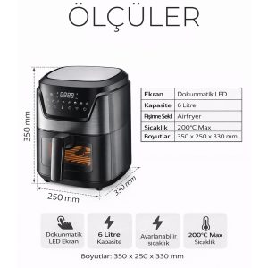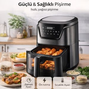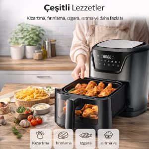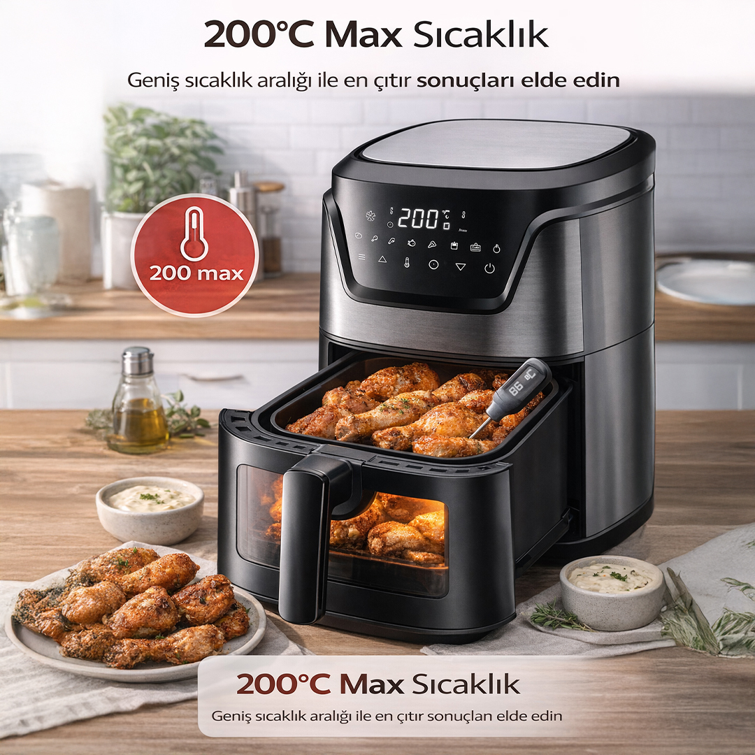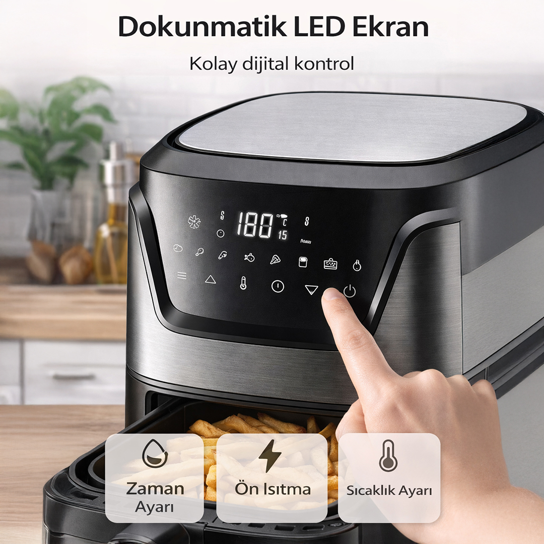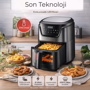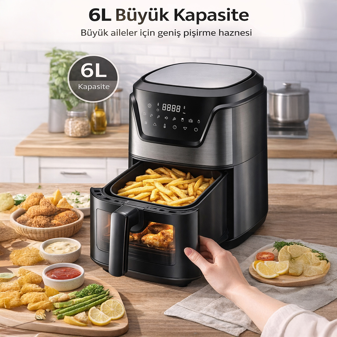 6 litrelik büyük iç hacim, aile yemekleri ve kalabalık sofralar için idealdir. Patates, tavuk, et, balık ve sebze gibi geniş yiyecek seçeneklerini tek seferde hazırlayabilirsiniz.