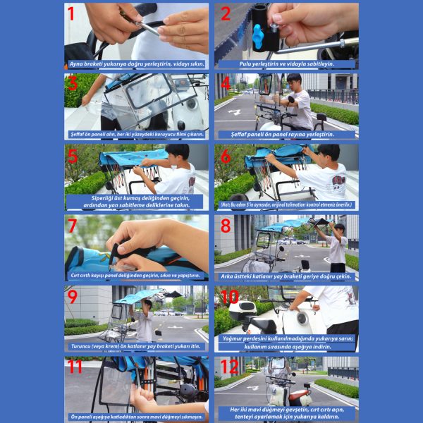 ürünü çok beğendim yağmur ve rüzgardan çok iyi koruyor.açıkçası negatif yorumlar vardi tereddüt ettim.kötü yorum yapanlar ürünün montajını tam olarak anlamamiş.mesela önü bulanık yazılmış.bulanık değil üzerinde çizilmemesi için jelatini var.çıkarınca cam gibi oluyor.takılıp çıkarılması cok pratik.montajıda basit.paket ićınden anahtar bile çıktı.ben aynaların alt ksmına monte ettim.diğer motorlarda değişebilir.pakette düzgün montaji yazılmamiş.kare kod var fakat açılmadı.nette baktık farklıydı.tamamen kendimiz parçalara göre bulduk.daha detaylı montaj videosu olabilir.çok hızlı geldi.ertesi gün elimdeydi