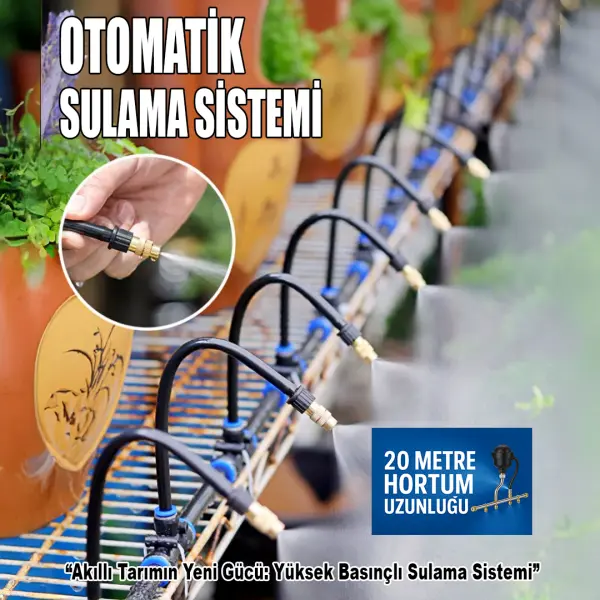 360° Ayarlanabilir otomatik sulama sistemi yüksek kaliteli pirinç başlıkları ve ayarlanabilir püskürtme açısıyla suyu ultra ince zerreciklere dönüştürerek ortamı serinletir, bitkilerinizi nemlendirir ve tozun bastırılmasına yardımcı olur. Enerji gerektirmez, yalnızca su basıncıyla çalışır.