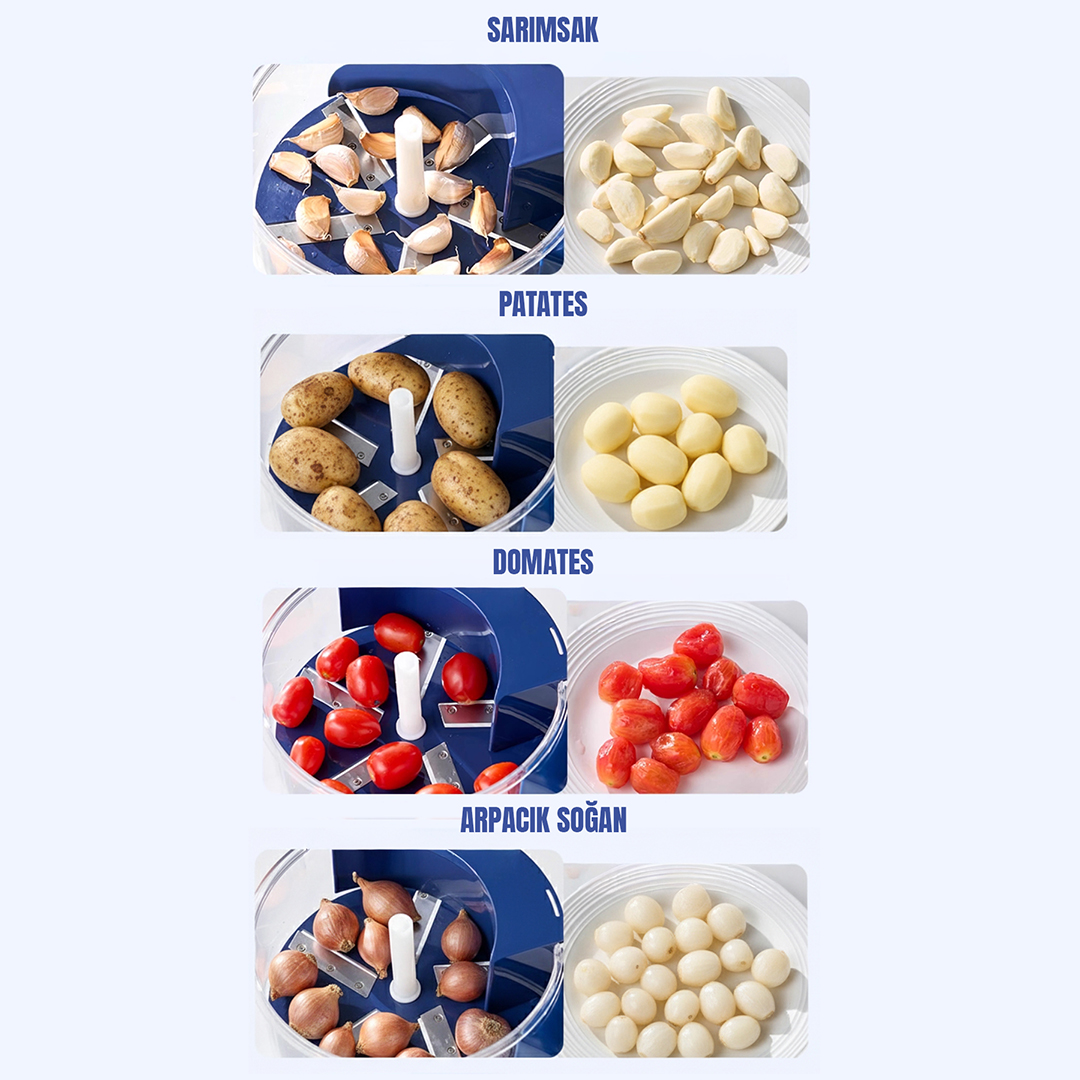 - Yüksek Hızlı Motor: Meyve sebzeleri ve sarımsakları saniyeler içinde soyarak zamandan tasarruf sağlar.