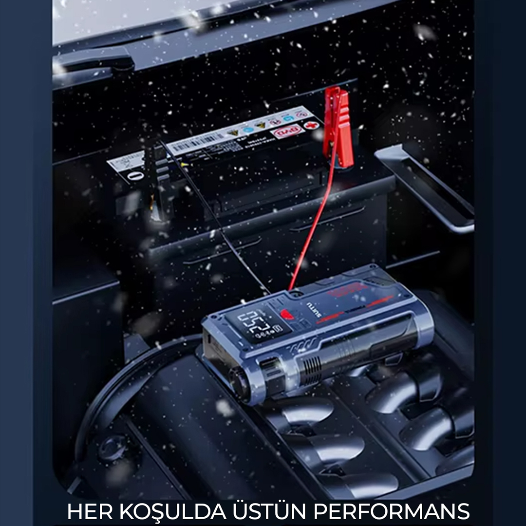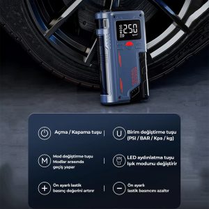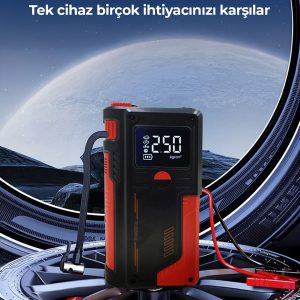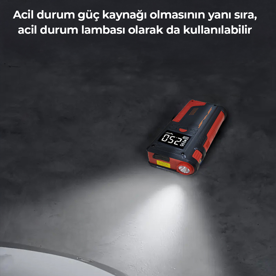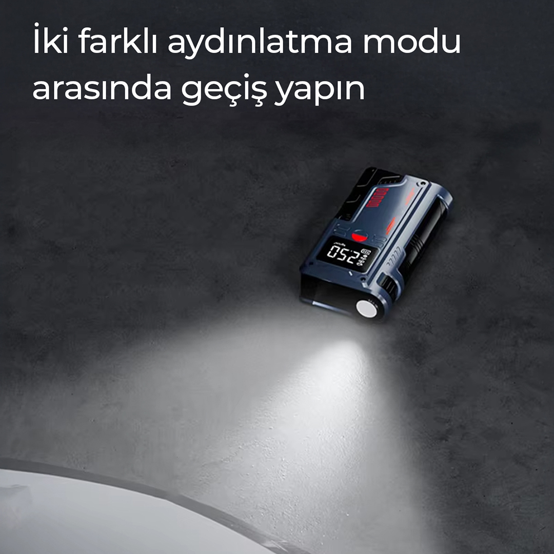 Yüksek performanslı Akü Takviye Cihazı, Lastik şişirici – Powebank – Led ışık özellikleri, güçlü çıkışı, kompakt tasarımı ve çok amaçlı kullanım özellikleriyle her sürücünün araçta bulundurması gereken hayat kurtarıcı bir üründür. Otomobil, motosiklet ve hafif ticari araçlar için ideal olan robo akü ateşleyici (jump starter), akünüz tamamen bitmiş olsa bile aracınızı kolayca çalıştırmanızı sağlar.