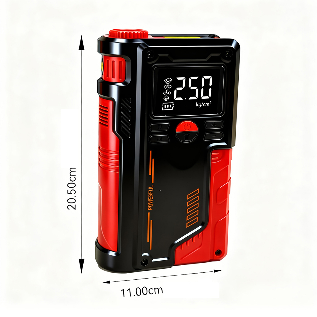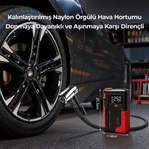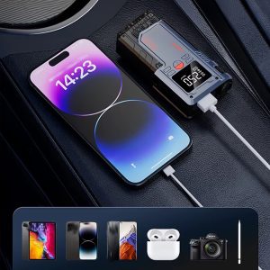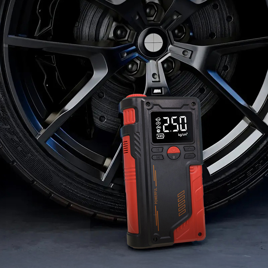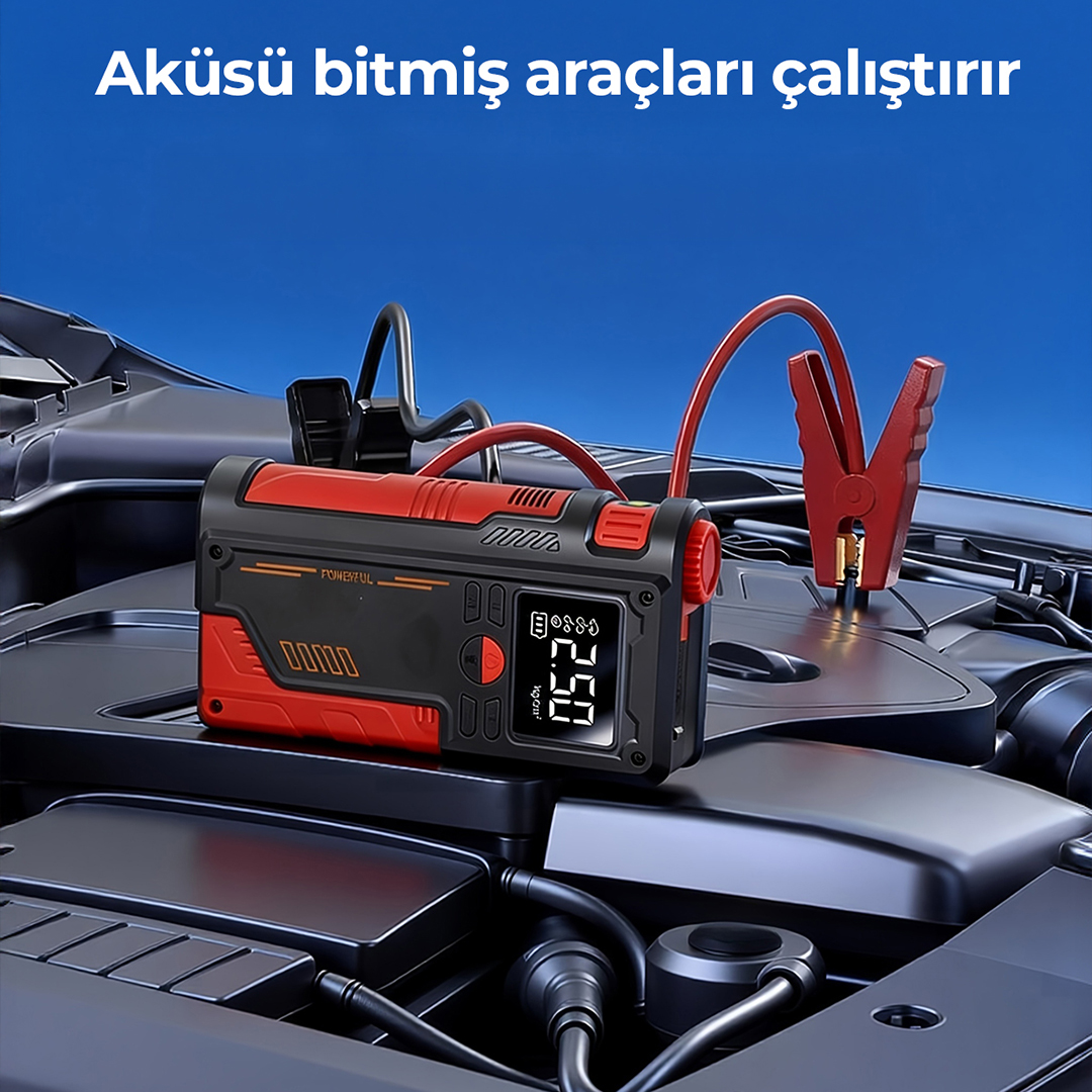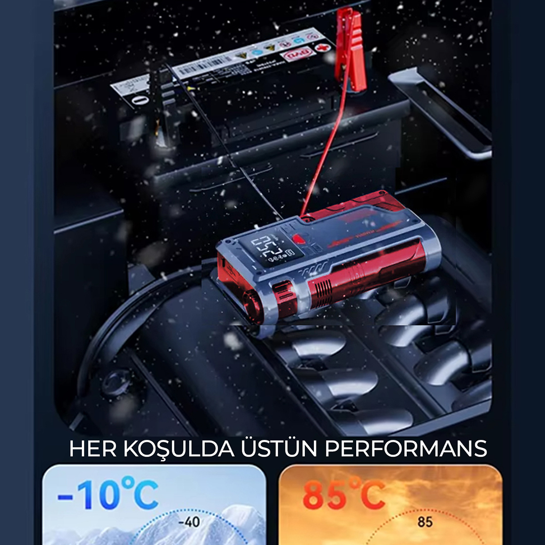 Yüksek performanslı Akü Takviye Cihazı, Lastik şişirici – Powebank – Led ışık özellikleri, güçlü çıkışı, kompakt tasarımı ve çok amaçlı kullanım özellikleriyle her sürücünün araçta bulundurması gereken hayat kurtarıcı bir üründür. Otomobil, motosiklet ve hafif ticari araçlar için ideal olan robo akü ateşleyici (jump starter), akünüz tamamen bitmiş olsa bile aracınızı kolayca çalıştırmanızı sağlar.